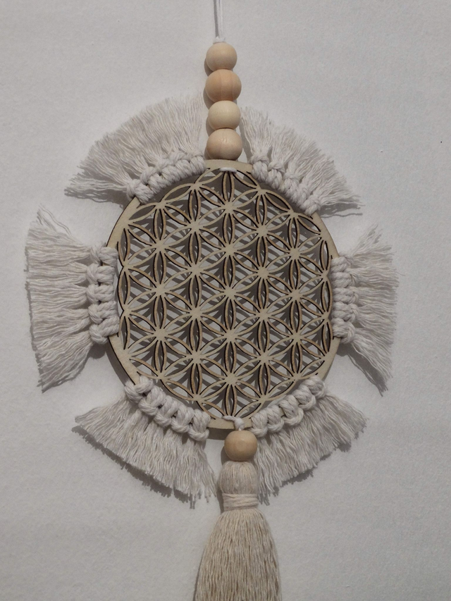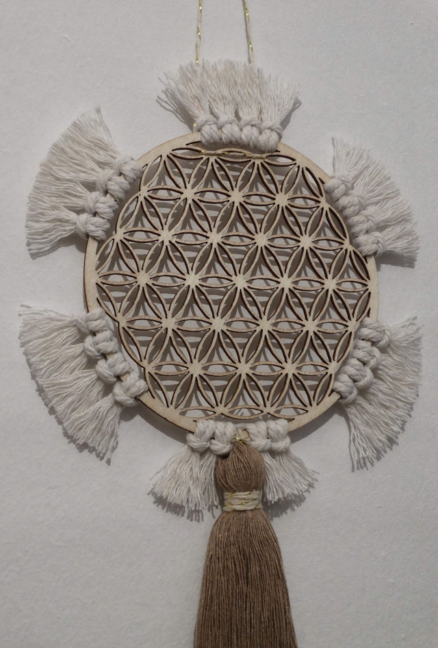 Superbe décoration murale représentant une FLEUR DE VIE EN BOIS ornée de fils de macramé et d'une pampille. Cette fleur de vie décorera une pièce de la maison, chambre, salon, entrée...
