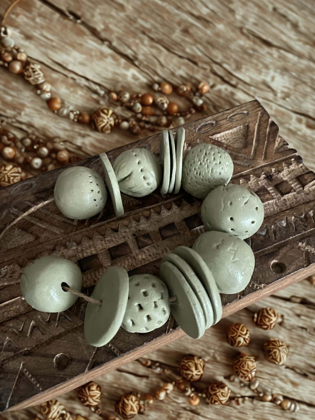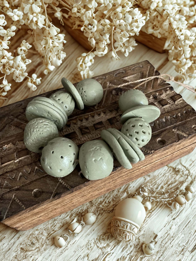 🎨 Les perles, aux formes rondes et plates, sont délicatement texturées et ponctuées de petits motifs, dans une douce teinte vert sauge inspirée de la nature 🌱