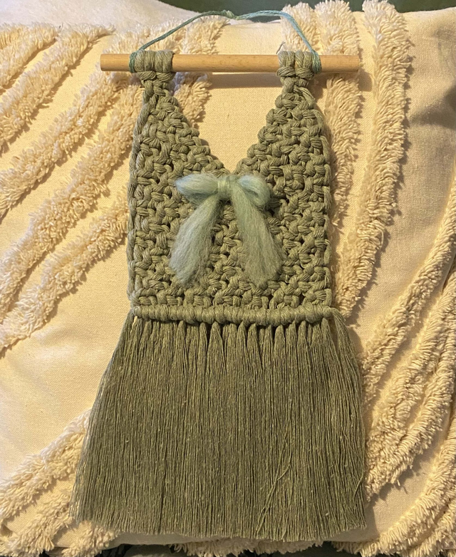 Apportez une touche de douceur et de poésie à votre intérieur avec cette délicate décoration murale en macramé, réalisée à la main. Inspirée de la forme d’une petite robe, elle séduit par son design bohème et minimaliste.