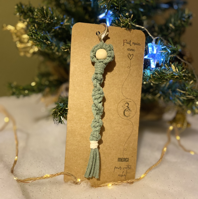 Ce PORTE-CLES en macramé est réalisé avec soin avec des fils de coton et une perle de bois de qualité.